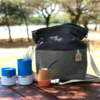 La mitad del bolso es rígido y acolchonado y la mitad flexible para poder doblarlo hacia afuera generando un organizador de mateadas.